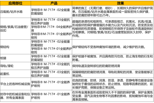 孚特菲®M-717系列产品是海洋重工业防腐的冠军产品。多年来,孚特菲®M-717系列产品在世界各地已被广泛应用于海洋石油工业防腐领域,包括海洋石油作业及生产过程的钻井平台、采油平台、FPSO、水下井口、多功能作业船、陆地接收终端、油套管、钢缆等各种作业设备的海洋环境下的重防腐等。