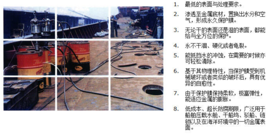 孚特菲®M-717系列产品可以在物体表面形成是一种无毒、无刺激性、不易燃的软防腐涂层, 且能够渗透已产生锈蚀内部,粘附并置换到金属孔中,封隔腐蚀环境并持续扩散开,具有保持柔韧、自我修复和高度耐盐水的特性。软涂层特性可以补偿热膨胀,不会像传统的硬涂层那样干燥或开裂,只需使用相当传统防腐涂料一小部分的用量即可提供长期卓越的防护功能。而且仅需简单进行表面预处理就可进行单层涂装,操作简便,减少了劳动力成本,提高了作业时效,降低了作业不安全因素。